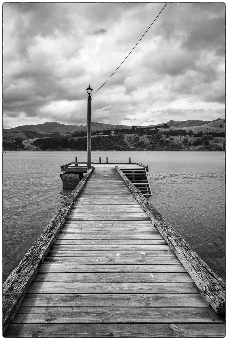 9 février 2024, 13 h 21 - Daly's Wharf vu depuis Beach Road, Akaroa, Nouvelle-Zélande